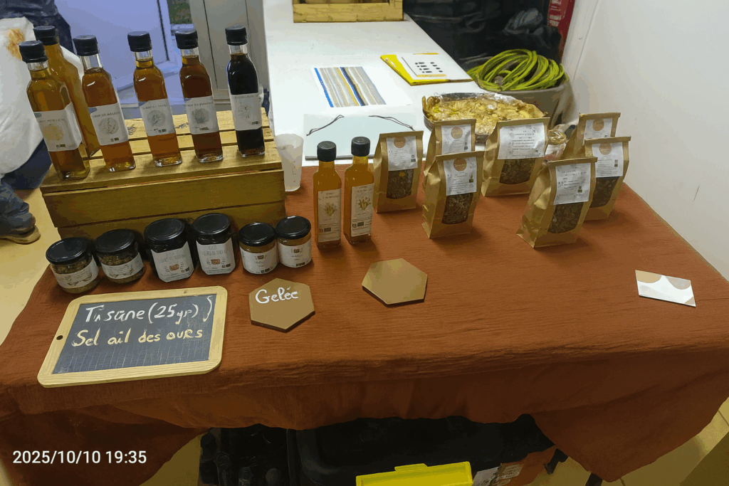 Manon WAGNER a présenté ses productions à base de fleurs : des tisanes (avec des nouveautés !) du sel à l’ail des ours, des sirops, des vinaigres ou des gelées réalisés avec les fleurs qu’elle cultivent.