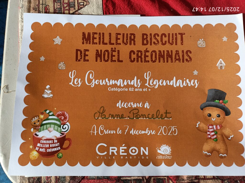 Anne a gagné le prix du plus beau biscuit dans sa catégorie et a pu donner sa première interview à Télé Canal Créonnais (interview à 2 minutes).